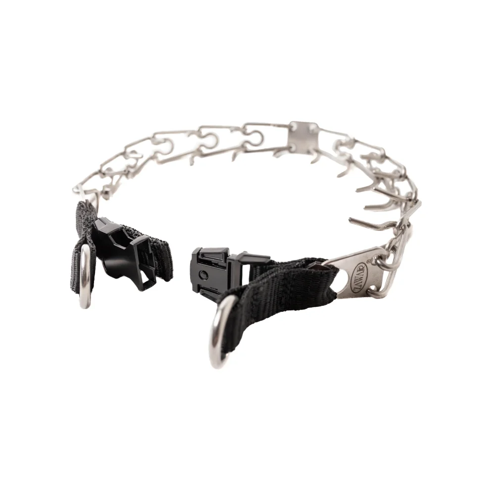 Também conhecido como “prong collar”, é confeccionado em aço inox de 4,0 mm. Apresenta fechamento com fita de polipropileno e fecho metálico (importado). Possui 12 garras (6 de cada lado). Circunferência máxima: 54 cm. Imagens ilustrativas. O valor não inclui frete. Recomendamos o uso deste produto por profissionais. Observação: protetor vendido separadamente, disponível na categoria “Acessórios”.