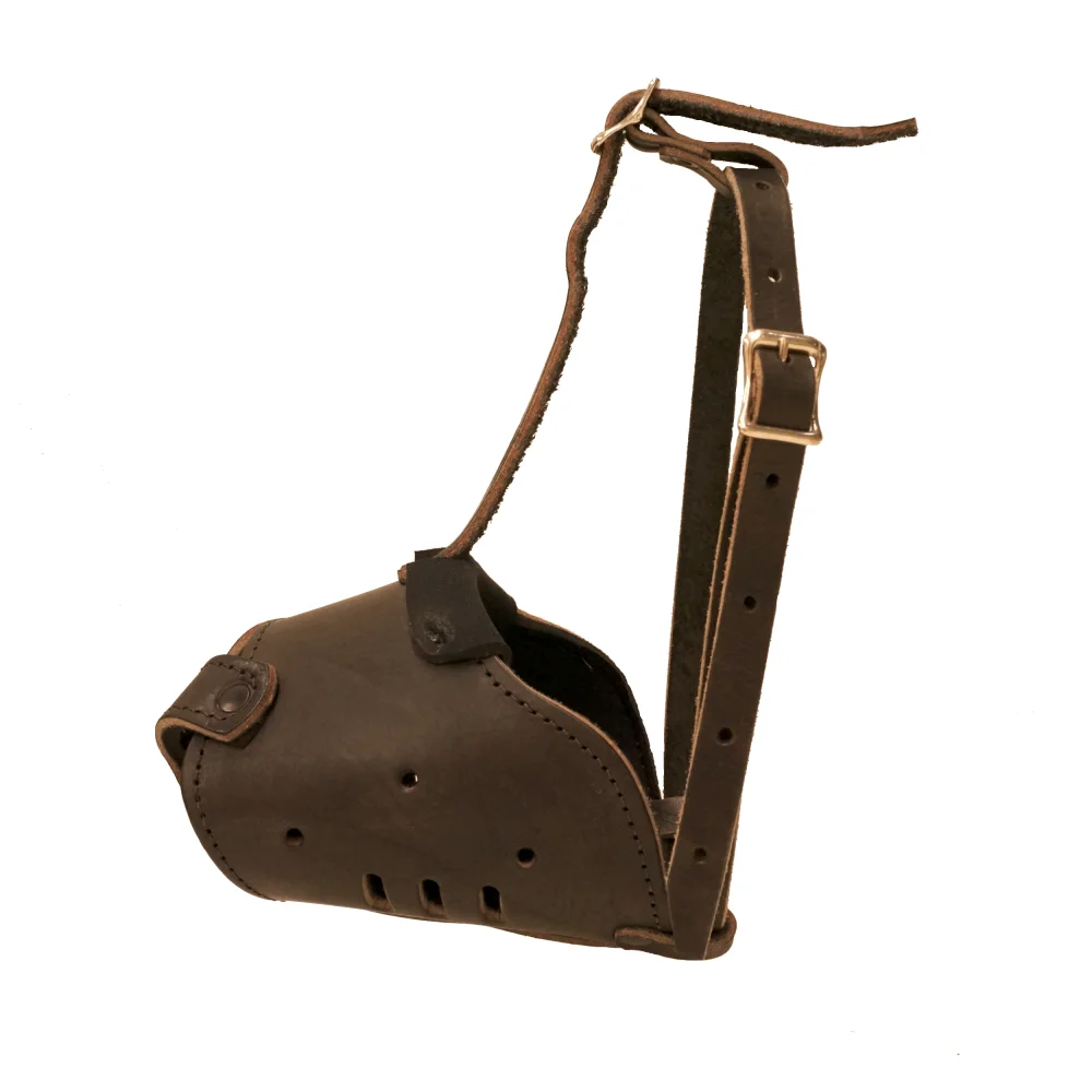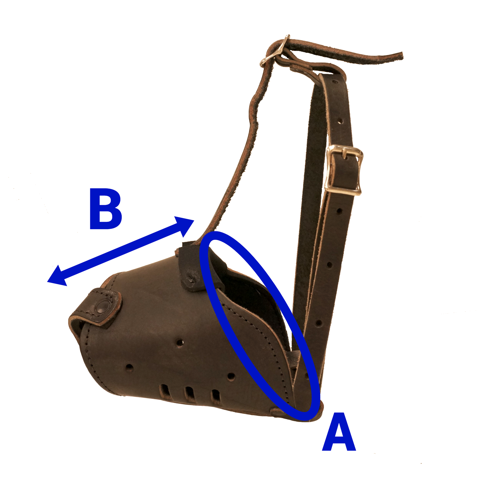 Confeccionada em couro, possui revestimento de E.V.A, na altura do focinho e permite boa ventilação. Muito leve e resistente, proporciona conforto ao cão. Indicada tanto para passeio, quanto imobilização. Imagens ilustrativas. O valor não inclui frete. Obs.: Ao escolher o modelo de focinheira mais adequado ao seu cão, recomendamos realizar as duas medidas (circunferência e comprimento do focinho), conforme imagem. Medidas aproximadas: A 31 cm; B 10 cm.