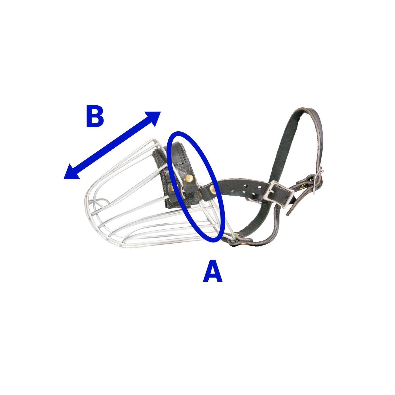 Confeccionada em aço inox, possui alças e revestimento interno de couro, com forração em neoprene. Leve e resistente, proporciona liberdade e segurança. Indicada para passeio. Imagens ilustrativas. O valor não inclui frete. Obs.: Ao escolher o modelo de focinheira mais adequado ao seu cão, recomendamos realizar as duas medidas (circunferência e comprimento do focinho), conforme imagem. Medidas aproximadas: A 34 cm; B 12 cm.