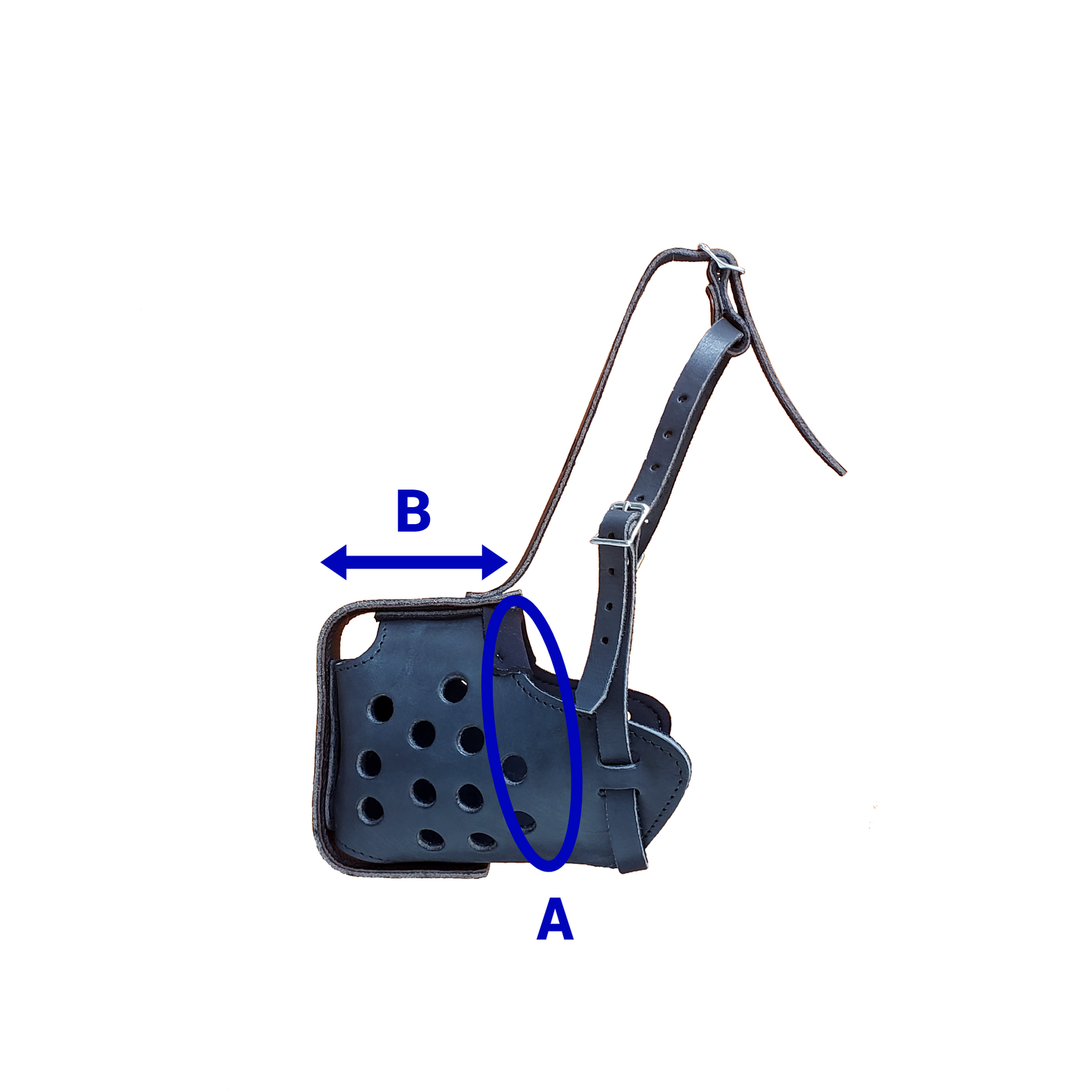 Confeccionada em couro e forrada com E.V.A, possui estrutura frontal em chapa de aço carbono, revestida em couro. As perfurações laterais permitem passagem de ar. Indicada tanto para trabalho, quanto imobilização. Imagens ilustrativas. O valor não inclui frete. Obs.: Ao escolher o modelo de focinheira mais adequado ao seu cão, recomendamos realizar as duas medidas (circunferência e comprimento do focinho), conforme imagem. Medidas aproximadas: A 37 cm; B 11 cm.
