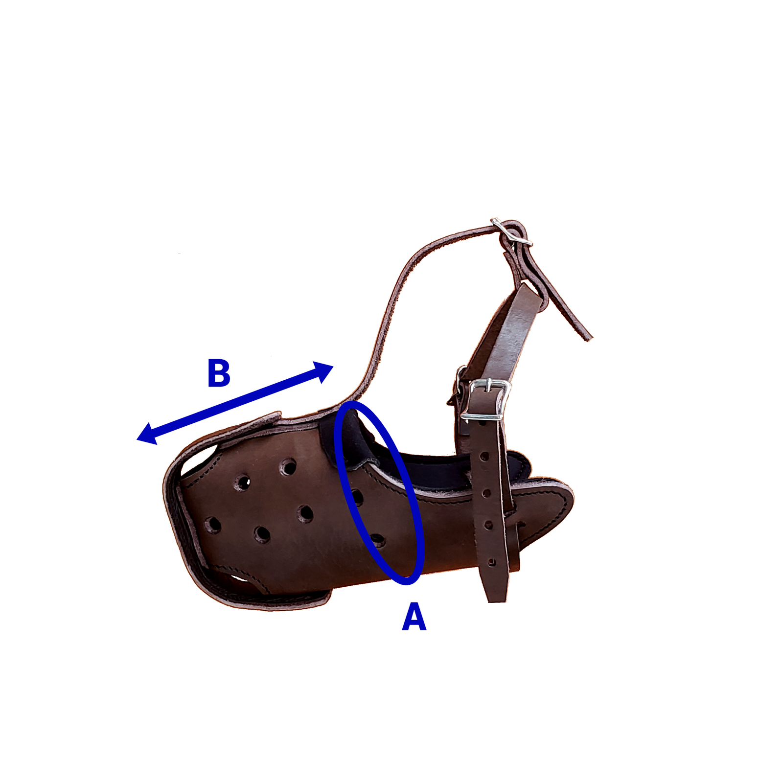 Confeccionada em couro e forrada com E.V.A, possui estrutura frontal em chapa de aço carbono, revestida em couro. As perfurações laterais permitem passagem de ar. Indicada tanto para trabalho, quanto imobilização. Imagens ilustrativas. O valor não inclui frete. Obs.: Ao escolher o modelo de focinheira mais adequado ao seu cão, recomendamos realizar as duas medidas (circunferência e comprimento do focinho), conforme imagem. Medidas aproximadas: A 27 cm; B 10 cm.