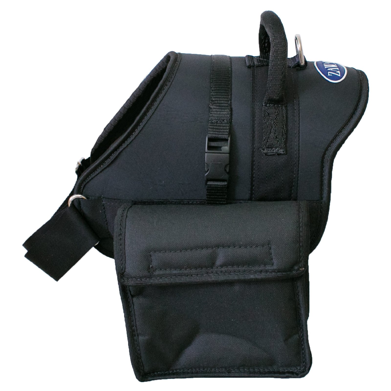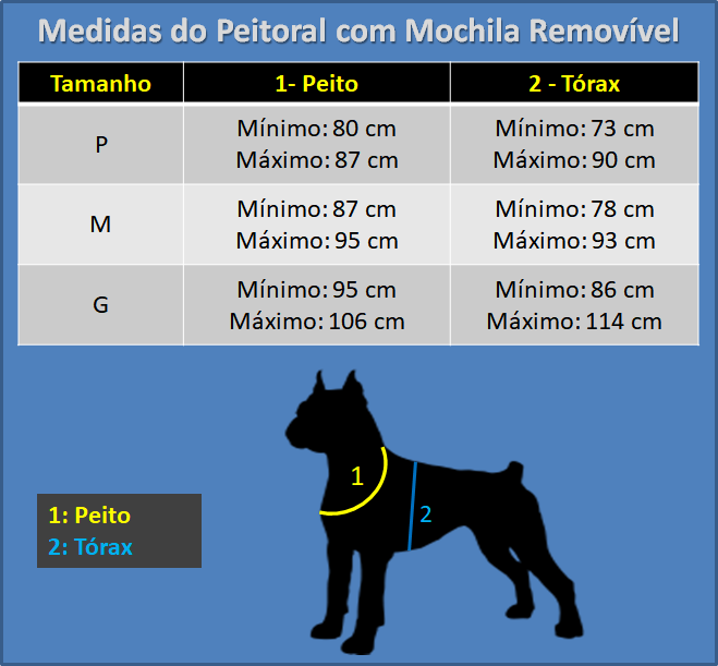 Confeccionado em nylon, recheado com E.V.A., envolve todo peito do cão. Possui duas bolsas laterais, fixadas com velcro e fecho de nylon, que possibilitma sua remoção. Consulte nossa tabela de medidas para saber qual o tamanho ideal de peitoral para seu cão. Imagens ilustrativas. O valor não inclui frete. Medidas aproximadas para o tórax do cão: de 81 cm a 108 cm.