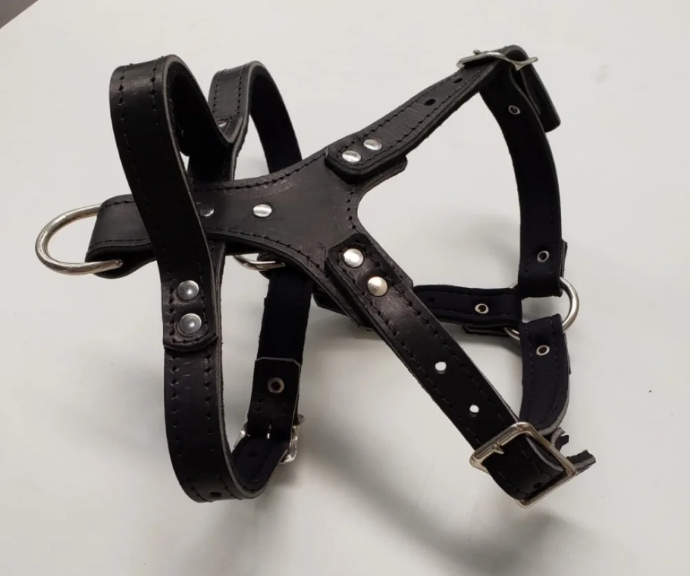 Confeccionado em couro engraxado de alta resistência e durabilidade. Utiliza argolas e fivelas super dimensionadas, bem como rebites nas junções. Imagens ilustrativas. O valor não inclui frete. Medidas aproximadas para o tórax do cão: de 68 cm a 82 cm.