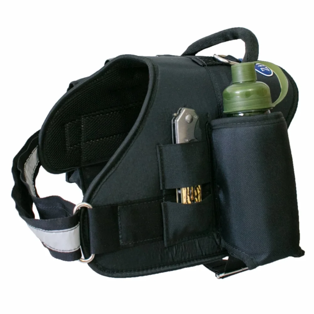 Confeccionado em nylon, possui fita de 5,0 cm (largura) regulável na altura do peito do cão, uma bolsa lateral e suportes para colocação do kit. Compõem o kit: um canivete automático, uma lanterna e uma garrafa de alumínio. Imagens ilustrativas. O valor não inclui frete. Medidas aproximadas para o tórax do cão: de 81 cm a 108 cm.